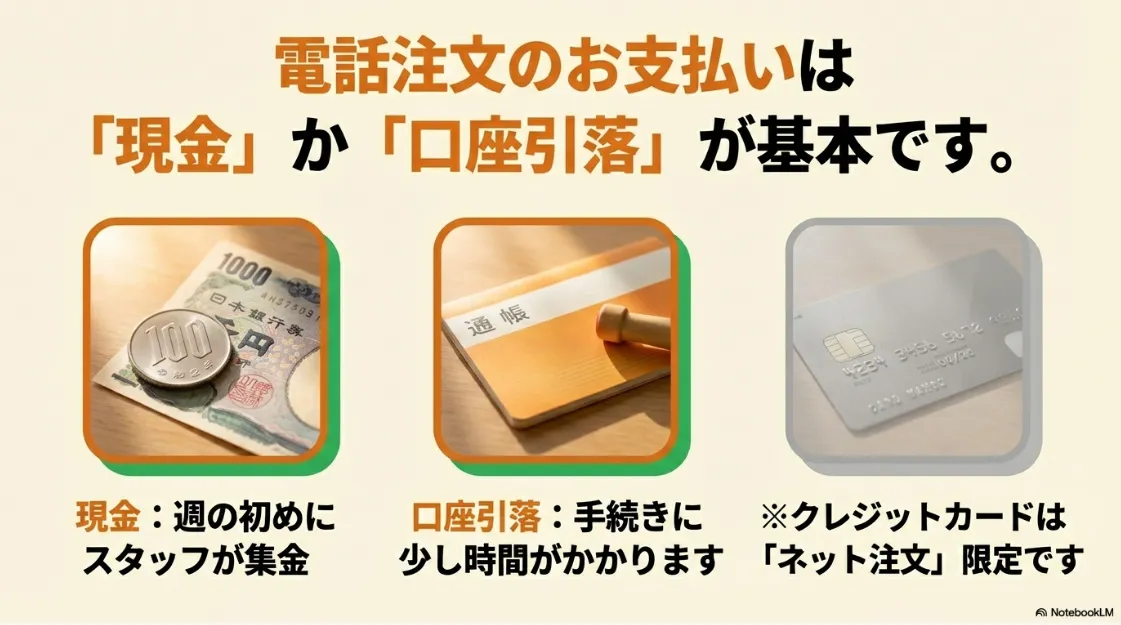 今回のテーマである「電話注文」の場合、システム上クレジットカードをその場で登録することが難しいため、原則として現金か口座振替のどちらかになります。