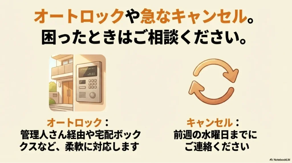 このように、鍵付きボックスを活用することで、「いつ来るか分からない」というストレスから解放されます。