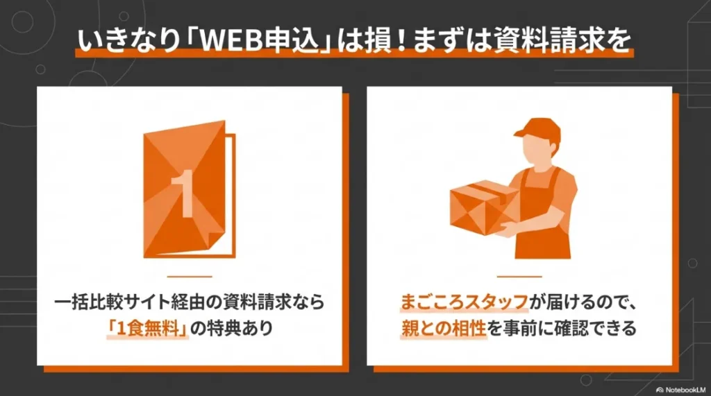 • 資料請求ルートを工夫して「1食無料」の限定特典を確実にゲットする方法