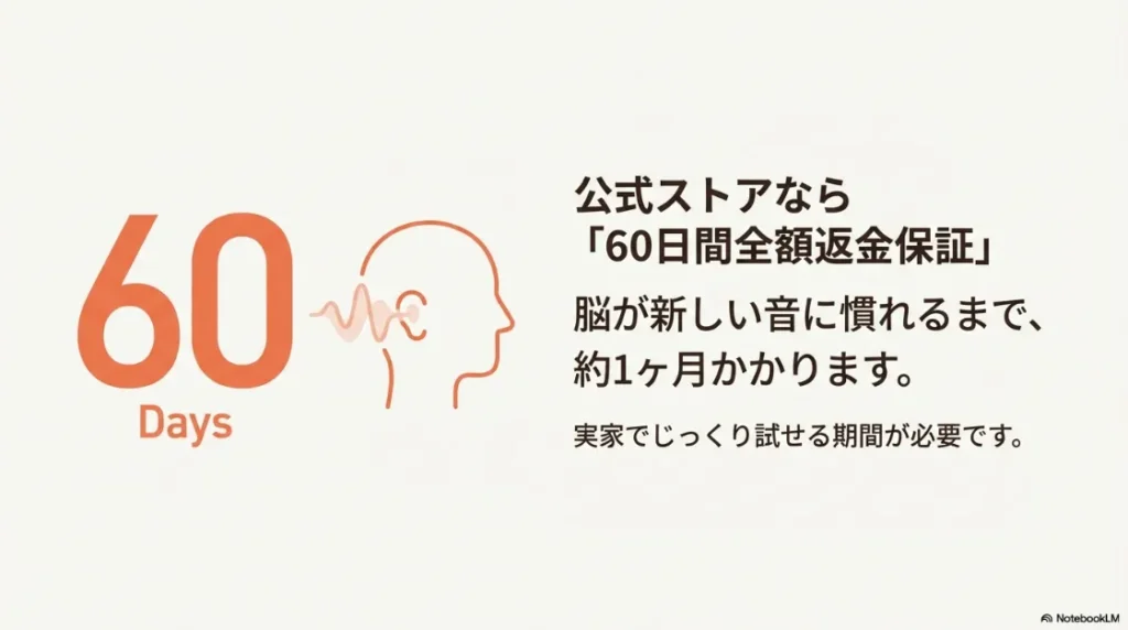 ミライスピーカーを公式サイトで購入する最大のメリットは、なんといっても「60日間返金保証」がついていることですね。スピーカーの効果は、どうしても使う人の聴力や部屋の環境に左右されてしまいます。
